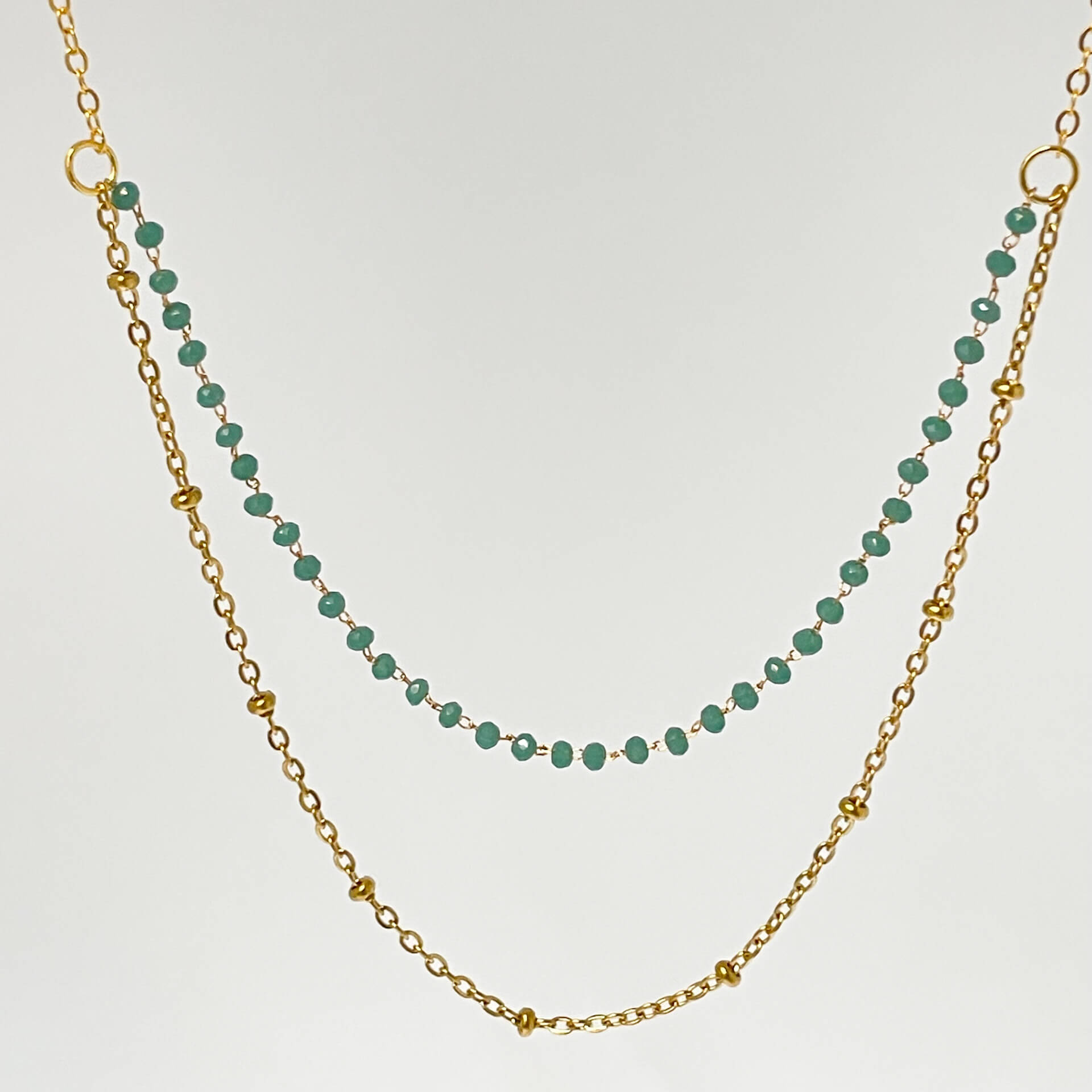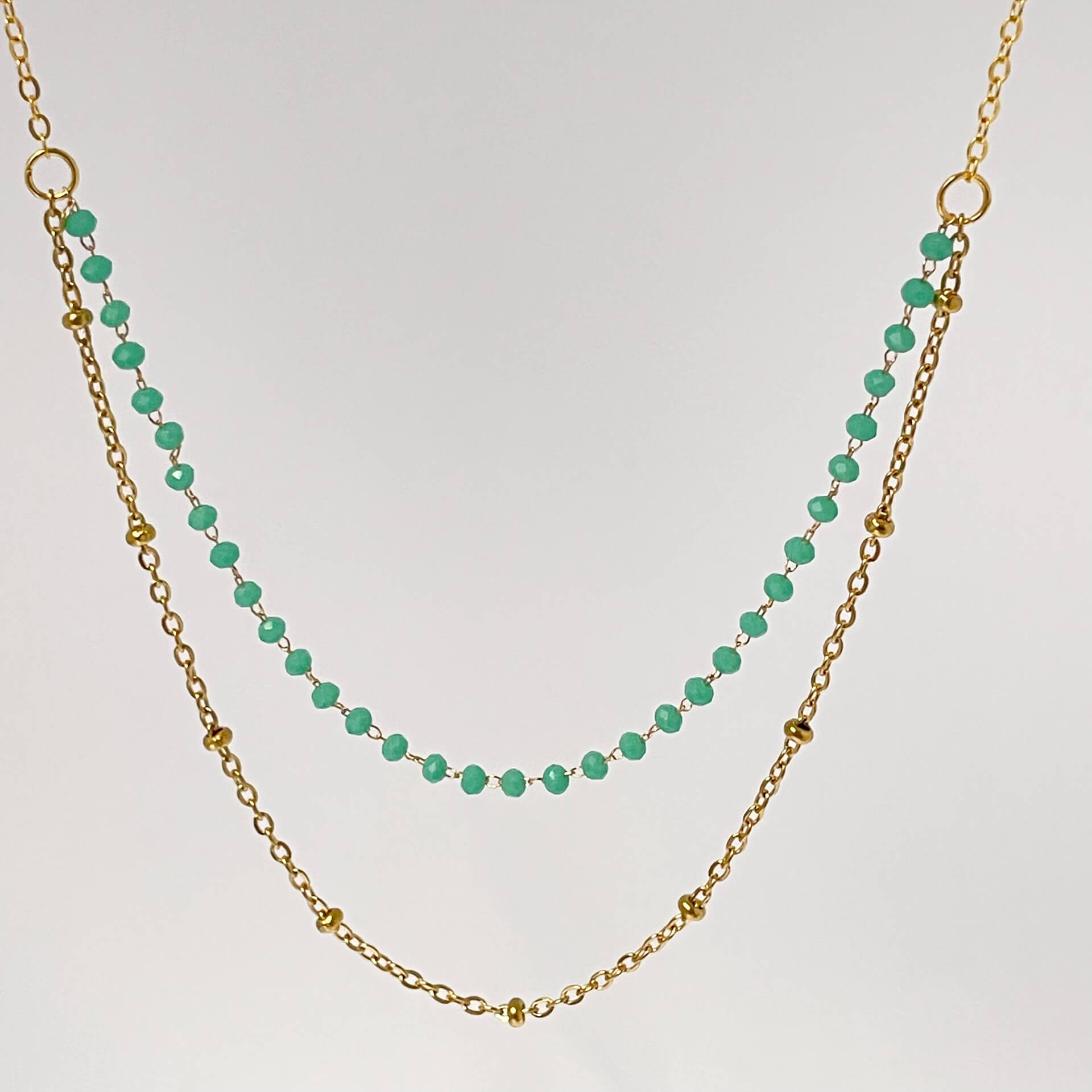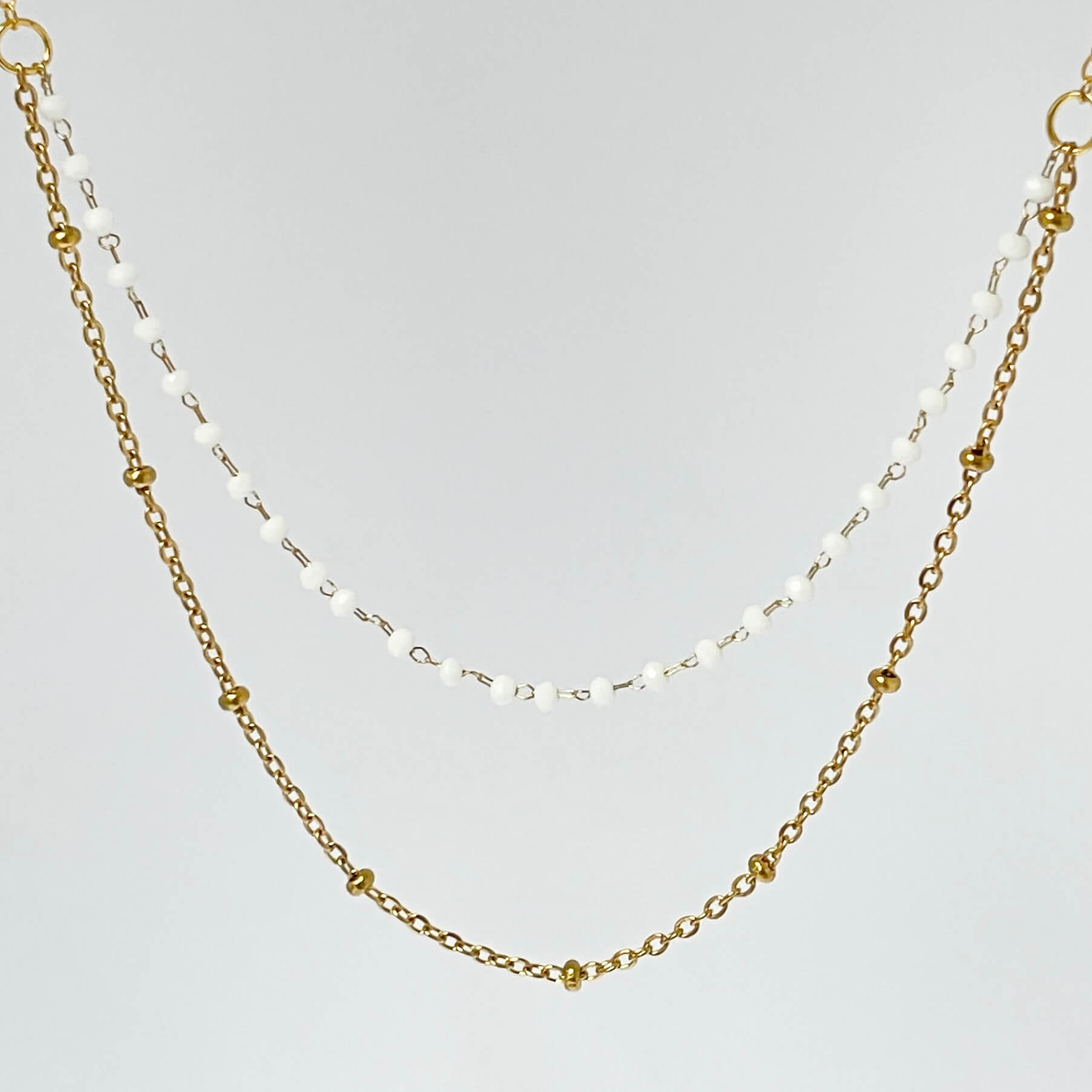 Collier double en acier inoxydable et perles de verre, doté d’un fermoir unique qui évite les colliers emmêlés. Ce bijou crée un effet d’accumulation sans effort : un seul fermoir, deux rangs apparents. Pratique au quotidien, résistant et idéal pour un look superposé maîtrisé.